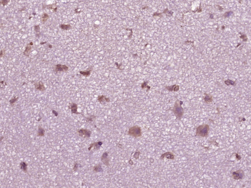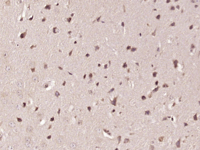 Paraformaldehyde-fixed, paraffin embedded (mouse brain tissue); Antigen retrieval by boiling in sodium citrate buffer (pH6.0) for 15min; Block endogenous peroxidase by 3% hydrogen peroxide for 20 minutes; Blocking buffer (normal goat serum) at 37°C for 30min; Antibody incubation with (HSF1 (Thr142)) Polyclonal Antibody, Unconjugated (bs-16678R) at 1:400 overnight at 4°C, followed by operating according to SP Kit(Rabbit) (sp-0023) instructionsand DAB staining.