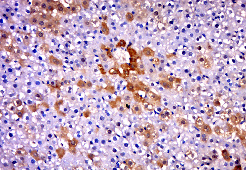 Paraformaldehyde-fixed, paraffin embedded (rat liver); Antigen retrieval by boiling in sodium citrate buffer (pH6.0) for 15min; Block endogenous peroxidase by 3% hydrogen peroxide for 20 minutes; Blocking buffer (normal goat serum) at 37°C for 30min; Antibody incubation with (TRIM5) Polyclonal Antibody, Unconjugated (bs-16745R) at 1:500 overnight at 4°C, followed by a conjugated secondary (sp-0023) for 20 minutes and DAB staining.