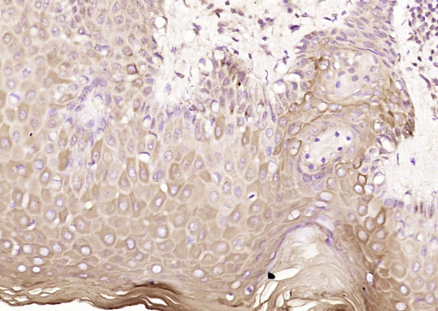 Paraformaldehyde-fixed, paraffin embedded (human skin cancer); Antigen retrieval by boiling in sodium citrate buffer (pH6.0) for 15min; Block endogenous peroxidase by 3% hydrogen peroxide for 20 minutes; Blocking buffer (normal goat serum) at 37°C for 30min; Antibody incubation with (Ataxin 3) Polyclonal Antibody, Unconjugated (bs-17208R) at 1:200 overnight at 4°C, followed by operating according to SP Kit(Rabbit) (sp-0023) instructionsand DAB staining.