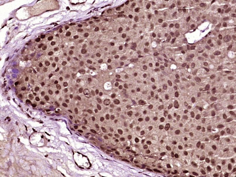 Paraformaldehyde-fixed, paraffin embedded (Human breast carcinoma); Antigen retrieval by boiling in sodium citrate buffer (pH6.0) for 15min; Block endogenous peroxidase by 3% hydrogen peroxide for 20 minutes; Blocking buffer (normal goat serum) at 37°C for 30min; Antibody incubation with (SC35) Polyclonal Antibody, Unconjugated (bs-17255R) at 1:400 overnight at 4°C, followed by operating according to SP Kit(Rabbit) (sp-0023) instructionsand DAB staining.