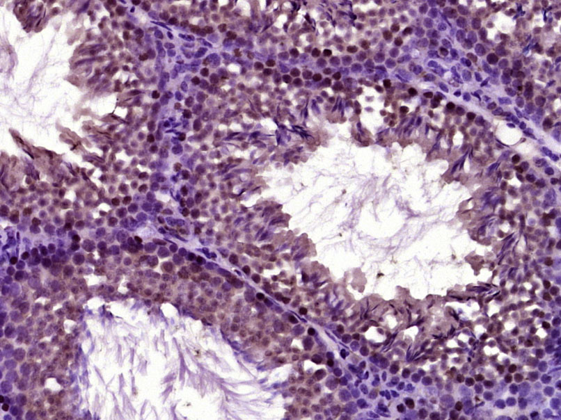 Paraformaldehyde-fixed, paraffin embedded (Mouse testis); Antigen retrieval by boiling in sodium citrate buffer (pH6.0) for 15min; Block endogenous peroxidase by 3% hydrogen peroxide for 20 minutes; Blocking buffer (normal goat serum) at 37°C for 30min; Antibody incubation with (SC35) Polyclonal Antibody, Unconjugated (bs-17255R) at 1:400 overnight at 4°C, followed by operating according to SP Kit(Rabbit) (sp-0023) instructionsand DAB staining.