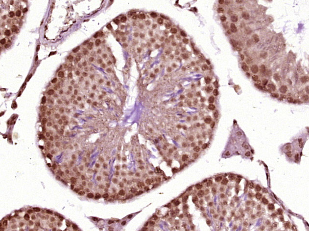Paraformaldehyde-fixed, paraffin embedded (mouse testis tissue); Antigen retrieval by boiling in sodium citrate buffer (pH6.0) for 15min; Block endogenous peroxidase by 3% hydrogen peroxide for 20 minutes; Blocking buffer (normal goat serum) at 37°C for 30min; Antibody incubation with (SFRS2IP) Polyclonal Antibody, Unconjugated (bs-17298R) at 1:400 overnight at 4°C, followed by operating according to SP Kit(Rabbit) (sp-0023) instructionsand DAB staining.
