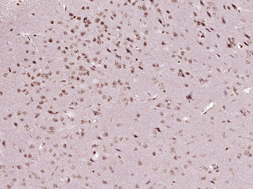 Paraformaldehyde-fixed, paraffin embedded (Mouse brain); Antigen retrieval by boiling in sodium citrate buffer (pH6.0) for 15min; Block endogenous peroxidase by 3% hydrogen peroxide for 20 minutes; Blocking buffer (normal goat serum) at 37°C for 30min; Antibody incubation with (SFRS8) Polyclonal Antibody, Unconjugated (bs-17302R) at 1:400 overnight at 4°C, followed by operating according to SP Kit(Rabbit) (sp-0023) instructionsand DAB staining.