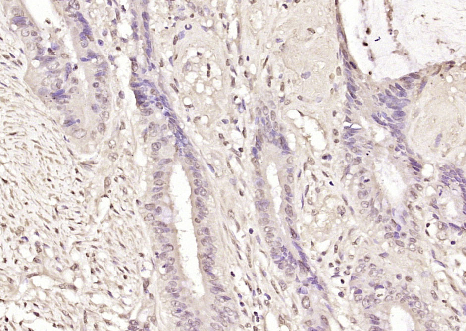 Paraformaldehyde-fixed, paraffin embedded (human colon carcinoma); Antigen retrieval by boiling in sodium citrate buffer (pH6.0) for 15min; Block endogenous peroxidase by 3% hydrogen peroxide for 20 minutes; Blocking buffer (normal goat serum) at 37°C for 30min; Antibody incubation with (Topoisomerase II beta) Polyclonal Antibody, Unconjugated (bs-17324R) at 1:200 overnight at 4°C, followed by operating according to SP Kit(Rabbit) (sp-0023) instructionsand DAB staining.
