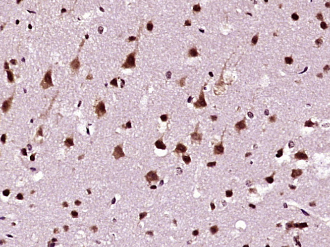 Paraformaldehyde-fixed, paraffin embedded (mouse brain tissue); Antigen retrieval by boiling in sodium citrate buffer (pH6.0) for 15min; Block endogenous peroxidase by 3% hydrogen peroxide for 20 minutes; Blocking buffer (normal goat serum) at 37°C for 30min; Antibody incubation with (hnRNP DL) Polyclonal Antibody, Unconjugated (bs-17343R) at 1:400 overnight at 4°C, followed by operating according to SP Kit(Rabbit) (sp-0023) instructionsand DAB staining.