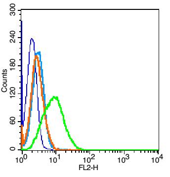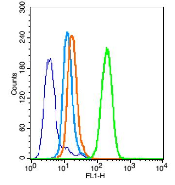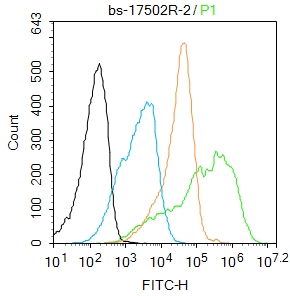 Overlay histogram showing HL 60 cells stained with bs-17502R (Green line). The cells were fixed with 90% methanol (5 min) and then permeabilized with 0.01M PBS-Tween for 20 min. The cells were then incubated in 1x PBS / 10% normal goat serum to block non-specific protein-protein interactions followed by the antibody (bs-17502R,1μg/1x10^6 cells) for 30 min at 22℃. The secondary antibody used was fluorescein isothiocyanate goat anti-rabbit IgG (H+L) (bs- 0295G-FITC , Brillant blue line) at 1/200 dilution for 30 min at 22℃. Isotype control antibody was rabbit IgG (polyclonal,bs-0295P,Orange line) (1μg/1x10^6 cells) used under the same conditions. Unlabelled sample (blue line) was also used as a control. Acquisition of 20,000 events were collected using a 20mW Argon ion laser (488nm) and 525/30 bandpass filter.