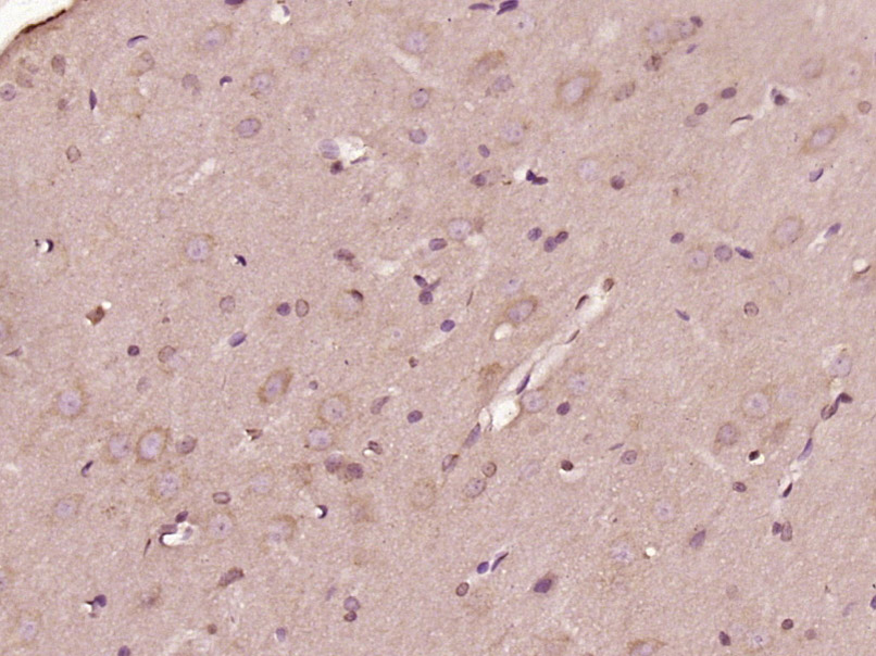 Paraformaldehyde-fixed, paraffin embedded (Rat brain); Antigen retrieval by boiling in sodium citrate buffer (pH6.0) for 15min; Block endogenous peroxidase by 3% hydrogen peroxide for 20 minutes; Blocking buffer (normal goat serum) at 37°C for 30min; Antibody incubation with (OTUD1) Polyclonal Antibody, Unconjugated (bs-17563R) at 1:400 overnight at 4°C, followed by operating according to SP Kit(Rabbit) (sp-0023) instructionsand DAB staining.