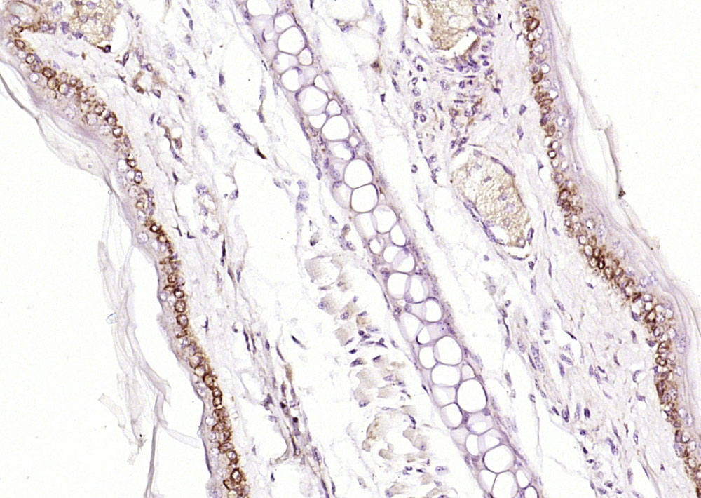 Paraformaldehyde-fixed, paraffin embedded (mouse skin); Antigen retrieval by boiling in sodium citrate buffer (pH6.0) for 15min; Block endogenous peroxidase by 3% hydrogen peroxide for 20 minutes; Blocking buffer (normal goat serum) at 37°C for 30min; Antibody incubation with (p21-ARC) Polyclonal Antibody, Unconjugated (bs-17589R) at 1:200 overnight at 4°C, followed by operating according to SP Kit(Rabbit) (sp-0023) instructionsand DAB staining.