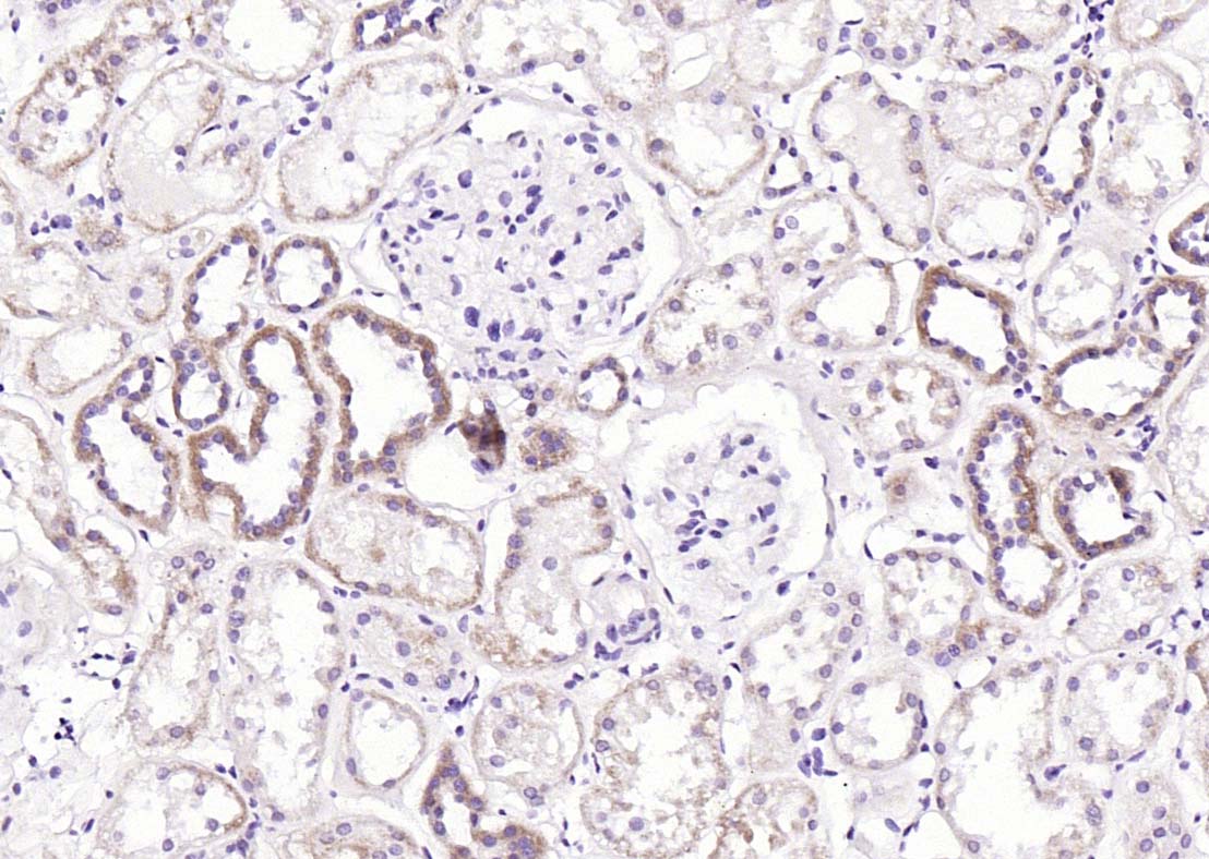 Paraformaldehyde-fixed, paraffin embedded (Human kidney); Antigen retrieval by boiling in sodium citrate buffer (pH6.0) for 15min; Block endogenous peroxidase by 3% hydrogen peroxide for 20 minutes; Blocking buffer (normal goat serum) at 37°C for 30min; Antibody incubation with (ATG14) Polyclonal Antibody, Unconjugated (bs-7462R) at 1:200 overnight at 4°C, followed by operating according to SP Kit(Rabbit) (sp-0023) instructionsand DAB staining.