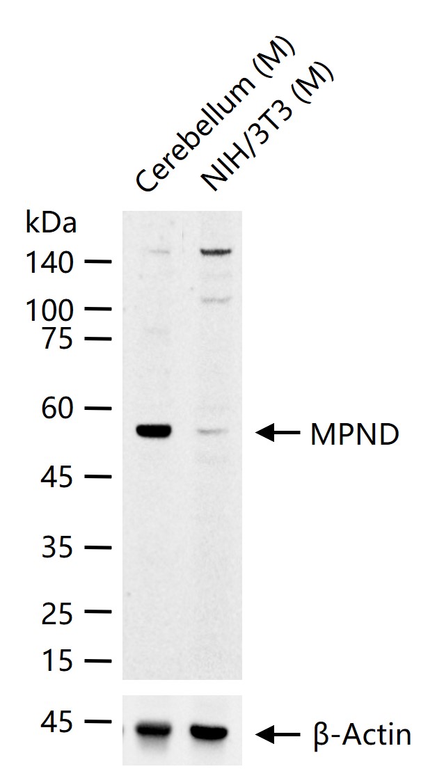 25 ug total protein per lane of various lysates (see on figure) probed with MPND polyclonal antibody, unconjugated (bs-17737R) at 1:1000 dilution and 4°C overnight incubation. Followed by conjugated secondary antibody incubation at r.t. for 60 min.