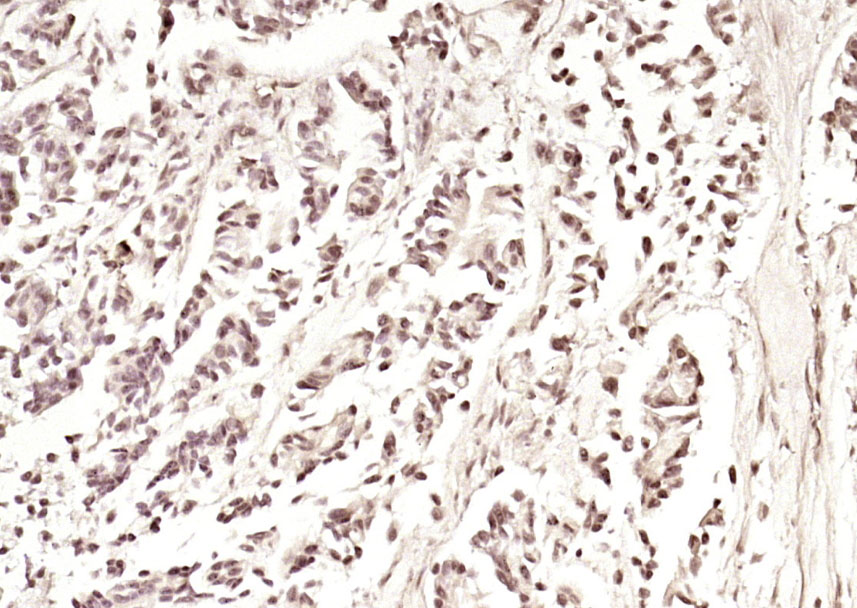 Paraformaldehyde-fixed, paraffin embedded (human gastric carcinoma); Antigen retrieval by boiling in sodium citrate buffer (pH6.0) for 15min; Block endogenous peroxidase by 3% hydrogen peroxide for 20 minutes; Blocking buffer (normal goat serum) at 37°C for 30min; Antibody incubation with (PIK3R5) Polyclonal Antibody, Unconjugated (bs-7467R) at 1:200 overnight at 4°C, followed by operating according to SP Kit(Rabbit) (sp-0023) instructionsand DAB staining.