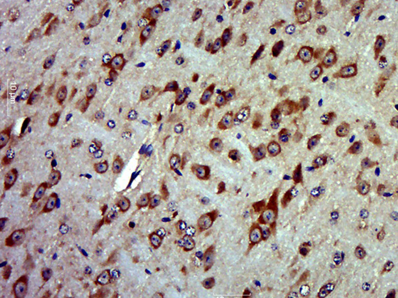 Paraformaldehyde-fixed, paraffin embedded (Mouse brain); Antigen retrieval by boiling in sodium citrate buffer (pH6.0) for 15min; Block endogenous peroxidase by 3% hydrogen peroxide for 20 minutes; Blocking buffer (normal goat serum) at 37°C for 30min; Antibody incubation with (MTRF1) Polyclonal Antibody, Unconjugated (bs-17893R) at 1:400 overnight at 4°C, followed by operating according to SP Kit(Rabbit) (sp-0023) instructionsand DAB staining.