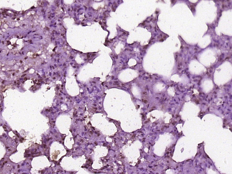 Paraformaldehyde-fixed, paraffin embedded (Rat lung); Antigen retrieval by boiling in sodium citrate buffer (pH6.0) for 15min; Block endogenous peroxidase by 3% hydrogen peroxide for 20 minutes; Blocking buffer (normal goat serum) at 37°C for 30min; Antibody incubation with (HMG2L1) Polyclonal Antibody, Unconjugated (bs-18051R) at 1:400 overnight at 4°C, followed by operating according to SP Kit(Rabbit) (sp-0023) instructionsand DAB staining.