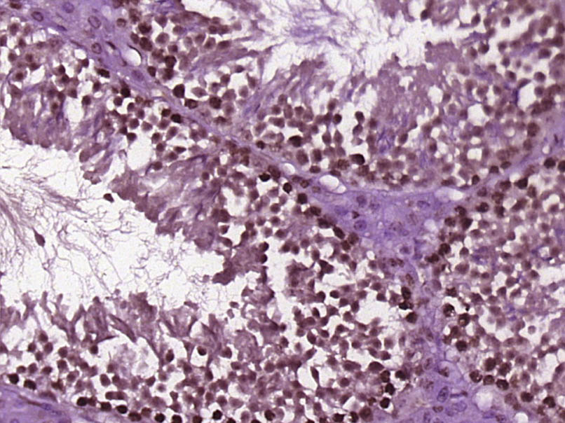 Paraformaldehyde-fixed, paraffin embedded (Mouse testis); Antigen retrieval by boiling in sodium citrate buffer (pH6.0) for 15min; Block endogenous peroxidase by 3% hydrogen peroxide for 20 minutes; Blocking buffer (normal goat serum) at 37°C for 30min; Antibody incubation with (HMG2L1) Polyclonal Antibody, Unconjugated (bs-18051R) at 1:400 overnight at 4°C, followed by operating according to SP Kit(Rabbit) (sp-0023) instructionsand DAB staining.