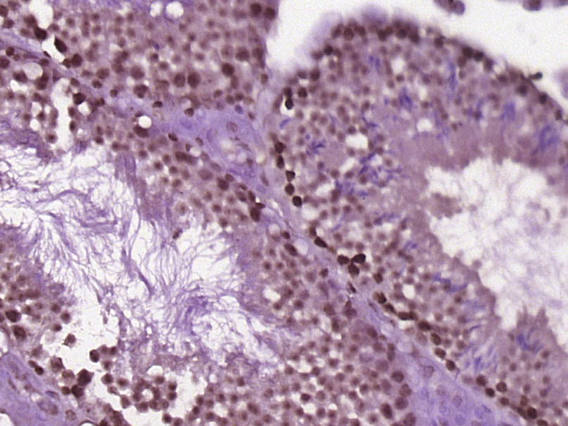 Paraformaldehyde-fixed, paraffin embedded (Mouse testis); Antigen retrieval by boiling in sodium citrate buffer (pH6.0) for 15min; Block endogenous peroxidase by 3% hydrogen peroxide for 20 minutes; Blocking buffer (normal goat serum) at 37°C for 30min; Antibody incubation with (HMGN3) Polyclonal Antibody, Unconjugated (bs-18055R) at 1:400 overnight at 4°C, followed by operating according to SP Kit(Rabbit) (sp-0023) instructionsand DAB staining.