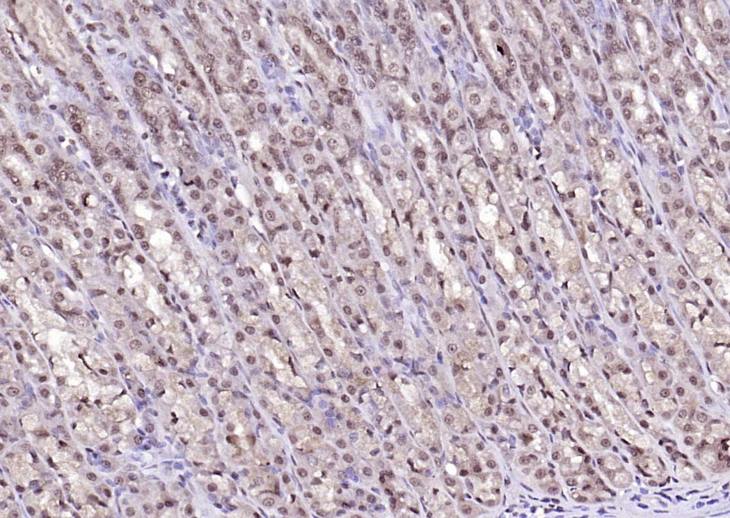 Paraformaldehyde-fixed, paraffin embedded (rat stomach); Antigen retrieval by boiling in sodium citrate buffer (pH6.0) for 15min; Block endogenous peroxidase by 3% hydrogen peroxide for 20 minutes; Blocking buffer (normal goat serum) at 37°C for 30min; Antibody incubation with (LSM3) Polyclonal Antibody, Unconjugated (bs-18428R) at 1:200 overnight at 4°C, followed by operating according to SP Kit(Rabbit) (sp-0023) instructionsand DAB staining.