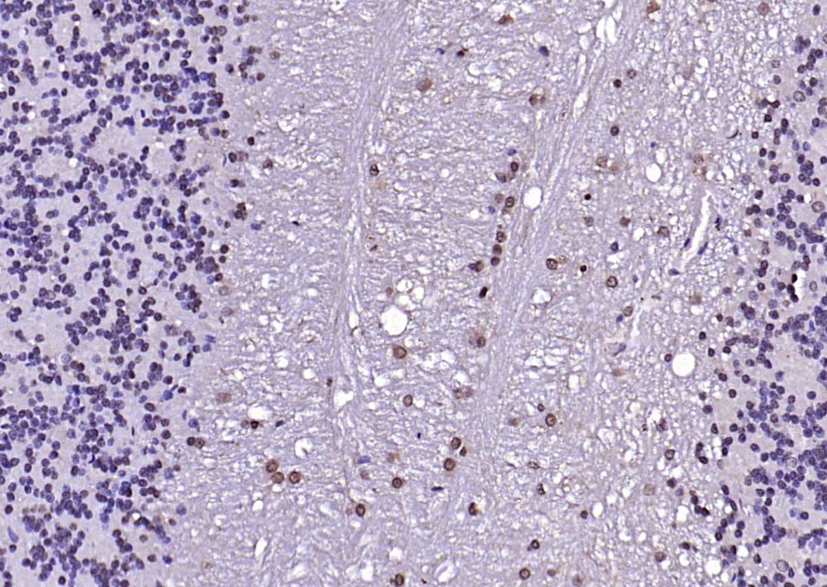 Paraformaldehyde-fixed, paraffin embedded (mouse cerebellum); Antigen retrieval by boiling in sodium citrate buffer (pH6.0) for 15min; Block endogenous peroxidase by 3% hydrogen peroxide for 20 minutes; Blocking buffer (normal goat serum) at 37°C for 30min; Antibody incubation with (LSM3) Polyclonal Antibody, Unconjugated (bs-18428R) at 1:200 overnight at 4°C, followed by operating according to SP Kit(Rabbit) (sp-0023) instructionsand DAB staining.