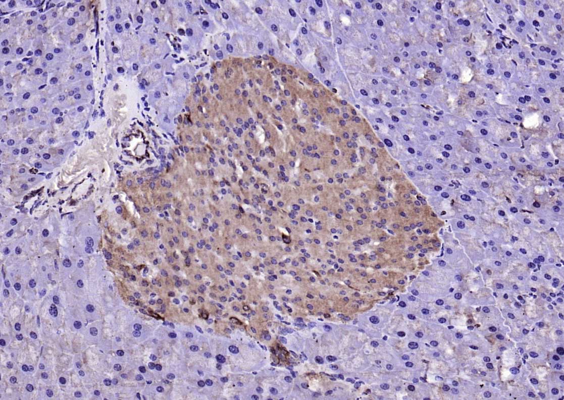 Paraformaldehyde-fixed, paraffin embedded (mouse pancreas); Antigen retrieval by boiling in sodium citrate buffer (pH6.0) for 15min; Block endogenous peroxidase by 3% hydrogen peroxide for 20 minutes; Blocking buffer (normal goat serum) at 37°C for 30min; Antibody incubation with (LSM3) Polyclonal Antibody, Unconjugated (bs-18428R) at 1:200 overnight at 4°C, followed by operating according to SP Kit(Rabbit) (sp-0023) instructionsand DAB staining.