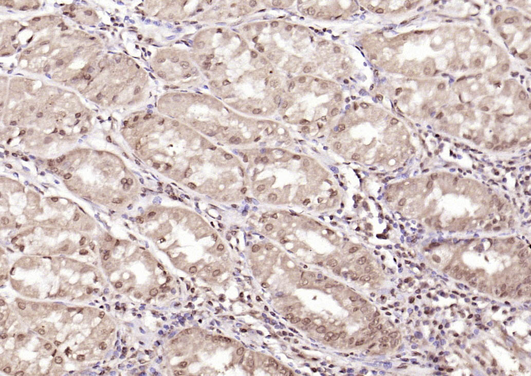 Paraformaldehyde-fixed, paraffin embedded (human gastric); Antigen retrieval by boiling in sodium citrate buffer (pH6.0) for 15min; Block endogenous peroxidase by 3% hydrogen peroxide for 20 minutes; Blocking buffer (normal goat serum) at 37°C for 30min; Antibody incubation with (LSM6) Polyclonal Antibody, Unconjugated (bs-18431R) at 1:200 overnight at 4°C, followed by operating according to SP Kit(Rabbit) (sp-0023) instructionsand DAB staining.