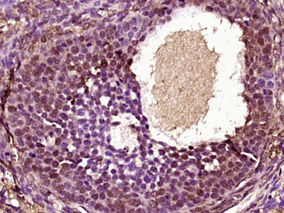 Paraformaldehyde-fixed, paraffin embedded (Rat ovary); Antigen retrieval by boiling in sodium citrate buffer (pH6.0) for 15min; Block endogenous peroxidase by 3% hydrogen peroxide for 20 minutes; Blocking buffer (normal goat serum) at 37°C for 30min; Antibody incubation with (ZFP161) Polyclonal Antibody, Unconjugated (bs-18527R) at 1:400 overnight at 4°C, followed by operating according to SP Kit(Rabbit) (sp-0023) instructionsand DAB staining.