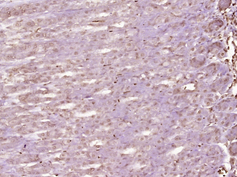 Paraformaldehyde-fixed, paraffin embedded (Mouse stomach); Antigen retrieval by boiling in sodium citrate buffer (pH6.0) for 15min; Block endogenous peroxidase by 3% hydrogen peroxide for 20 minutes; Blocking buffer (normal goat serum) at 37°C for 30min; Antibody incubation with (MCAF2) Polyclonal Antibody, Unconjugated (bs-18712R) at 1:400 overnight at 4°C, followed by operating according to SP Kit(Rabbit) (sp-0023) instructionsand DAB staining.