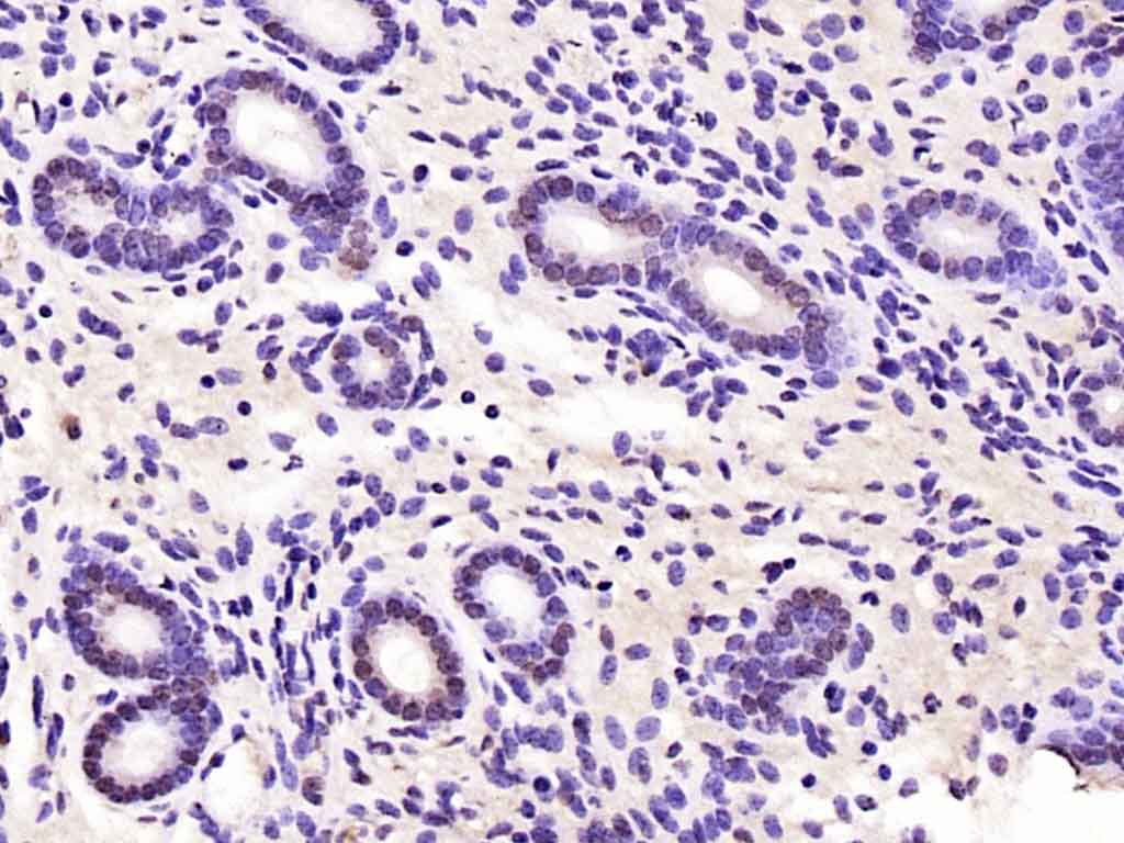 Paraformaldehyde-fixed, paraffin embedded (rat uterus); Antigen retrieval by boiling in sodium citrate buffer (pH6.0) for 15min; Block endogenous peroxidase by 3% hydrogen peroxide for 20 minutes; Blocking buffer (normal goat serum) at 37°C for 30min; Antibody incubation with (MCM-BP) Polyclonal Antibody, Unconjugated (bs-18727R) at 1:200 overnight at 4°C, followed by operating according to SP Kit(Rabbit) (sp-0023) instructionsand DAB staining.