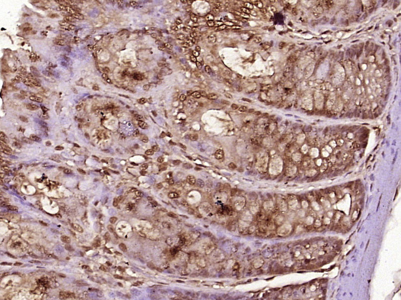 Paraformaldehyde-fixed, paraffin embedded (Rat colon); Antigen retrieval by boiling in sodium citrate buffer (pH6.0) for 15min; Block endogenous peroxidase by 3% hydrogen peroxide for 20 minutes; Blocking buffer (normal goat serum) at 37°C for 30min; Antibody incubation with (MED18) Polyclonal Antibody, Unconjugated (bs-18764R) at 1:400 overnight at 4°C, followed by operating according to SP Kit(Rabbit) (sp-0023) instructionsand DAB staining.