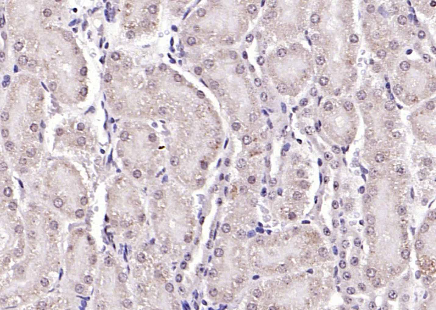 Paraformaldehyde-fixed, paraffin embedded (rat kidney); Antigen retrieval by boiling in sodium citrate buffer (pH6.0) for 15min; Block endogenous peroxidase by 3% hydrogen peroxide for 20 minutes; Blocking buffer (normal goat serum) at 37°C for 30min; Antibody incubation with (Nesprin 3) Polyclonal Antibody, Unconjugated (bs-19209R) at 1:200 overnight at 4°C, followed by operating according to SP Kit(Rabbit) (sp-0023) instructionsand DAB staining.