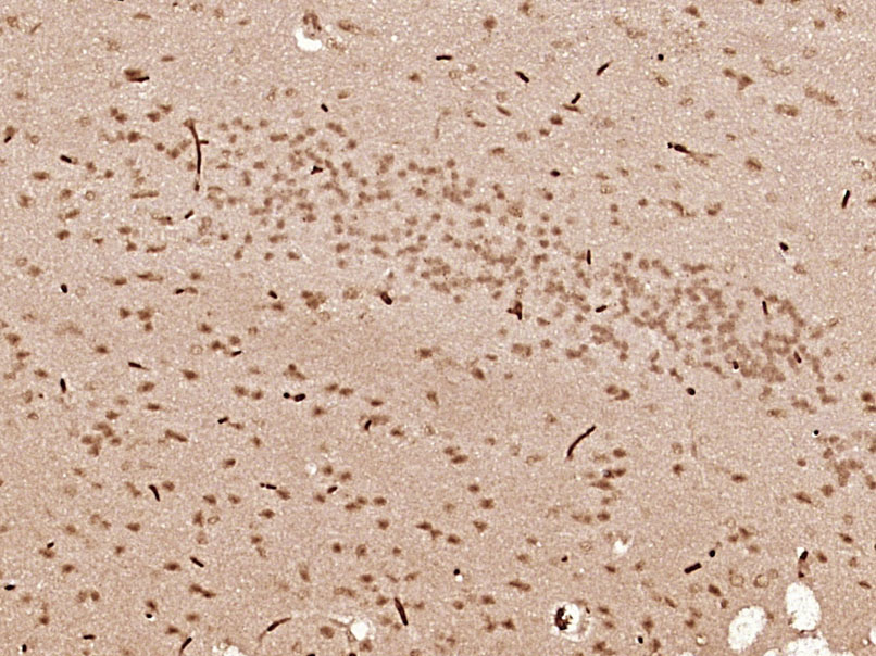 Paraformaldehyde-fixed, paraffin embedded (Mouse brain); Antigen retrieval by boiling in sodium citrate buffer (pH6.0) for 15min; Block endogenous peroxidase by 3% hydrogen peroxide for 20 minutes; Blocking buffer (normal goat serum) at 37°C for 30min; Antibody incubation with (NHP2L2) Polyclonal Antibody, Unconjugated (bs-19237R) at 1:400 overnight at 4°C, followed by operating according to SP Kit(Rabbit) (sp-0023) instructionsand DAB staining.