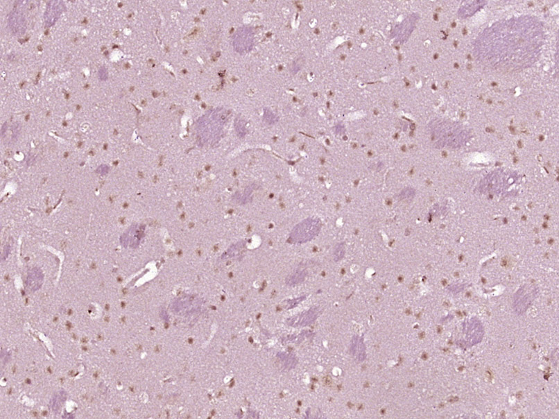 Paraformaldehyde-fixed, paraffin embedded (Mouse brain); Antigen retrieval by boiling in sodium citrate buffer (pH6.0) for 15min; Block endogenous peroxidase by 3% hydrogen peroxide for 20 minutes; Blocking buffer (normal goat serum) at 37°C for 30min; Antibody incubation with (NKRF) Polyclonal Antibody, Unconjugated (bs-19269R) at 1:400 overnight at 4°C, followed by operating according to SP Kit(Rabbit) (sp-0023) instructionsand DAB staining.