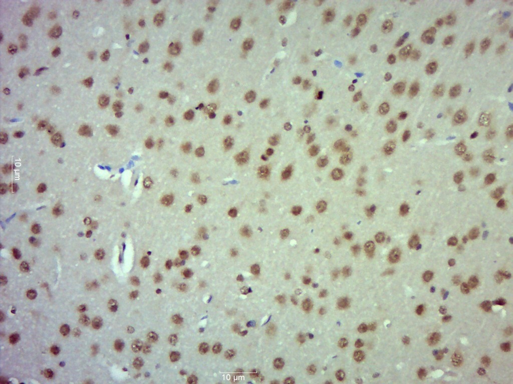 Paraformaldehyde-fixed, paraffin embedded (Rat brain); Antigen retrieval by boiling in sodium citrate buffer (pH6.0) for 15min; Block endogenous peroxidase by 3% hydrogen peroxide for 20 minutes; Blocking buffer (normal goat serum) at 37°C for 30min; Antibody incubation with (SFPQ) Polyclonal Antibody, Unconjugated (bs-19683R) at 1:500 overnight at 4°C, followed by a conjugated secondary (sp-0023) for 20 minutes and DAB staining.