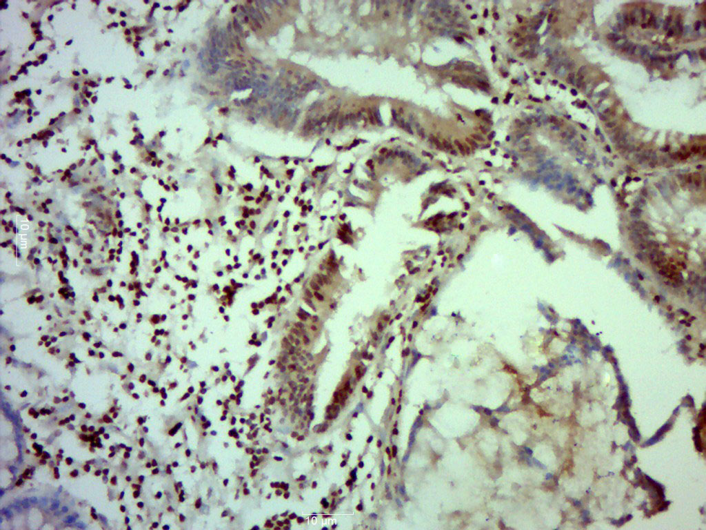 Paraformaldehyde-fixed, paraffin embedded (Human colon carcinoma); Antigen retrieval by boiling in sodium citrate buffer (pH6.0) for 15min; Block endogenous peroxidase by 3% hydrogen peroxide for 20 minutes; Blocking buffer (normal goat serum) at 37°C for 30min; Antibody incubation with (SFPQ) Polyclonal Antibody, Unconjugated (bs-19683R) at 1:500 overnight at 4°C, followed by a conjugated secondary (sp-0023) for 20 minutes and DAB staining.