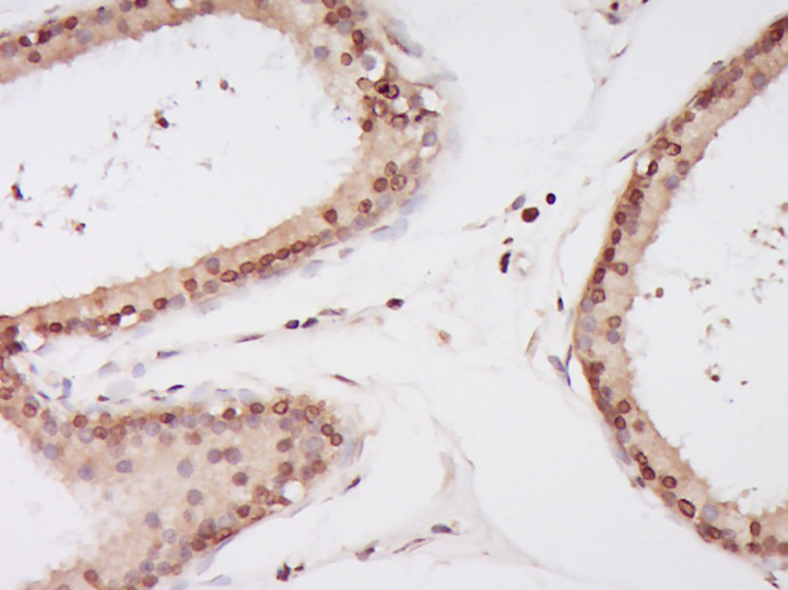 Paraformaldehyde-fixed, paraffin embedded (Rat prostate); Antigen retrieval by boiling in sodium citrate buffer (pH6.0) for 15min; Block endogenous peroxidase by 3% hydrogen peroxide for 20 minutes; Blocking buffer (normal goat serum) at 37°C for 30min; Antibody incubation with (SH3BP4) Polyclonal Antibody, Unconjugated (bs-19751R) at 1:400 overnight at 4°C, followed by operating according to SP Kit(Rabbit) (sp-0023) instructions and DAB staining.