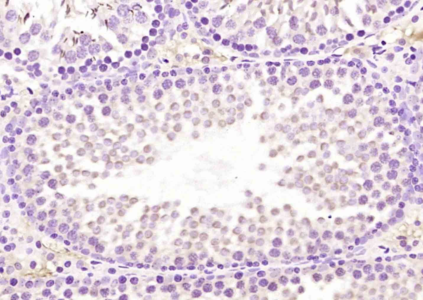 Paraformaldehyde-fixed, paraffin embedded (rat testis); Antigen retrieval by boiling in sodium citrate buffer (pH6.0) for 15min; Block endogenous peroxidase by 3% hydrogen peroxide for 20 minutes; Blocking buffer (normal goat serum) at 37°C for 30min; Antibody incubation with (RECQ1) Polyclonal Antibody, Unconjugated (bs-19784R) at 1:200 overnight at 4°C, followed by operating according to SP Kit(Rabbit) (sp-0023) instructionsand DAB staining.
