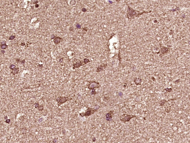 Paraformaldehyde-fixed, paraffin embedded (human brain glioma); Antigen retrieval by boiling in sodium citrate buffer (pH6.0) for 15min; Block endogenous peroxidase by 3% hydrogen peroxide for 20 minutes; Blocking buffer (normal goat serum) at 37°C for 30min; Antibody incubation with (Parkin (Ser65)) Polyclonal Antibody, Unconjugated (bs-19882R) at 1:400 overnight at 4°C, followed by operating according to SP Kit(Rabbit) (sp-0023) instructionsand DAB staining.