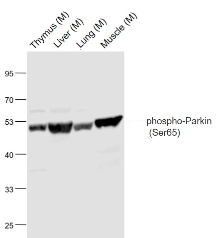Sample: Thymus (Mouse) Lysate at 40 ug Liver (Mouse) Lysate at 40 ug Lung (Mouse) Lysate at 40 ug Skeletal muscle (Mouse) Lysate at 40 ug Primary: Anti- phospho-Parkin (Ser65) (bs-19882R) at 1/1000 dilution Secondary: IRDye800CW Goat Anti-Rabbit IgG at 1/20000 dilution Predicted band size: 52 kD Observed band size: 52 kD
