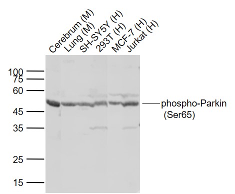Sample: Lane 1: Cerebrum (Mouse) Lysate at 40 ug Lane 2: Lung (Mouse) Lysate at 40 ug Lane 3: SH-SY5Y (Human) Cell Lysate at 30 ug Lane 4: 293T (Human) Cell Lysate at 30 ug Lane 5: MCF-7 (Human) Cell Lysate at 30 ug Lane 6: Jurkat (Human) Cell Lysate at 30 ug Primary: Anti-phospho-Parkin (Ser65) (bs-19882R) at 1/1000 dilution Secondary: IRDye800CW Goat Anti-Rabbit IgG at 1/20000 dilution Predicted band size: 52 kD Observed band size: 50 kD