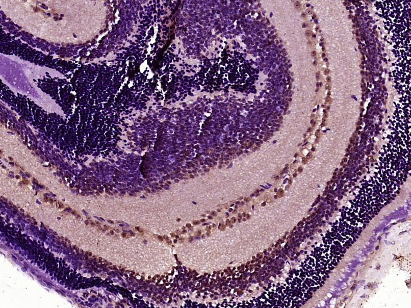 Paraformaldehyde-fixed, paraffin embedded (Rat brain); Antigen retrieval by boiling in sodium citrate buffer (pH6.0) for 15min; Block endogenous peroxidase by 3% hydrogen peroxide for 20 minutes; Blocking buffer (normal goat serum) at 37°C for 30min; Antibody incubation with (POU4F3) Polyclonal Antibody, Unconjugated (bs-21047R) at 1:400 overnight at 4°C, followed by operating according to SP Kit(Rabbit) (sp-0023) instructionsand DAB staining.