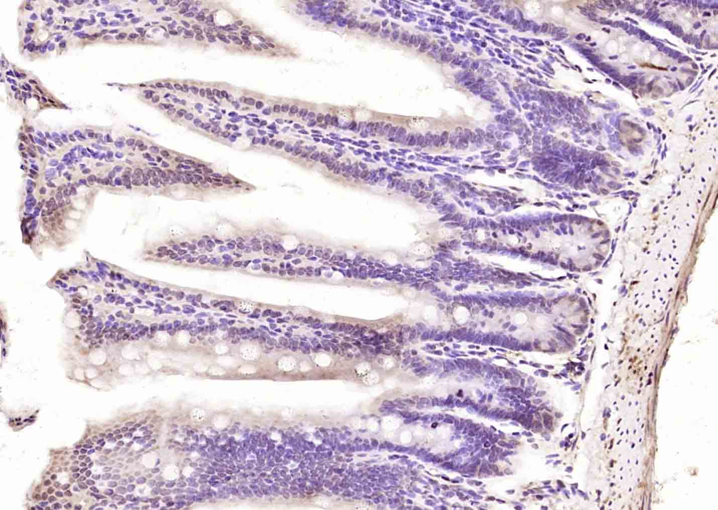 Paraformaldehyde-fixed, paraffin embedded (mouse intestine); Antigen retrieval by boiling in sodium citrate buffer (pH6.0) for 15min; Block endogenous peroxidase by 3% hydrogen peroxide for 20 minutes; Blocking buffer (normal goat serum) at 37°C for 30min; Antibody incubation with (POU6F1) Polyclonal Antibody, Unconjugated (bs-21049R) at 1:200 overnight at 4°C, followed by operating according to SP Kit(Rabbit) (sp-0023) instructionsand DAB staining.