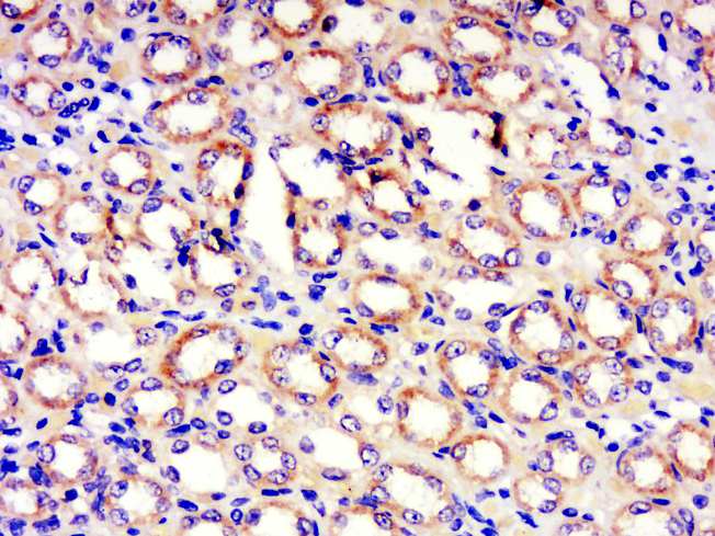 Paraformaldehyde-fixed, paraffin embedded (rat kidney); Antigen retrieval by boiling in sodium citrate buffer (pH6.0) for 15min; Block endogenous peroxidase by 3% hydrogen peroxide for 20 minutes; Blocking buffer (normal goat serum) at 37°C for 30min; Antibody incubation with (GRINA) Polyclonal Antibody, Unconjugated (bs-20059R) at 1:500 overnight at 4°C, followed by a conjugated secondary (sp-0023) for 20 minutes and DAB staining.