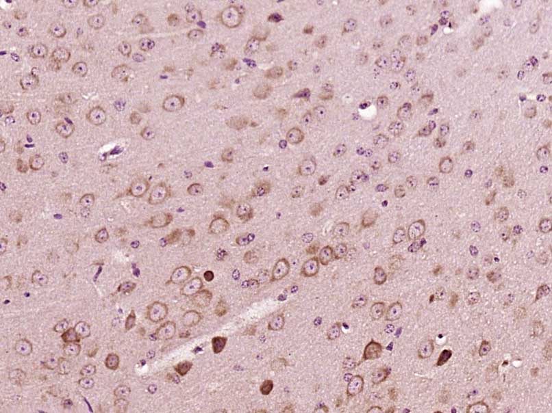 Paraformaldehyde-fixed, paraffin embedded (Mouse brain); Antigen retrieval by boiling in sodium citrate buffer (pH6.0) for 15min; Block endogenous peroxidase by 3% hydrogen peroxide for 20 minutes; Blocking buffer (normal goat serum) at 37°C for 30min; Antibody incubation with (PEX5) Polyclonal Antibody, Unconjugated (bs-12624R) at 1:400 overnight at 4°C, followed by operating according to SP Kit(Rabbit) (sp-0023) instructionsand DAB staining.