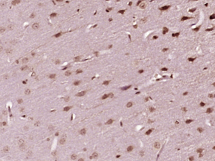 Paraformaldehyde-fixed, paraffin embedded (mouse brain tissue); Antigen retrieval by boiling in sodium citrate buffer (pH6.0) for 15min; Block endogenous peroxidase by 3% hydrogen peroxide for 20 minutes; Blocking buffer (normal goat serum) at 37°C for 30min; Antibody incubation with (PNRC2) Polyclonal Antibody, Unconjugated (bs-12748R) at 1:400 overnight at 4°C, followed by operating according to SP Kit(Rabbit) (sp-0023) instructionsand DAB staining.