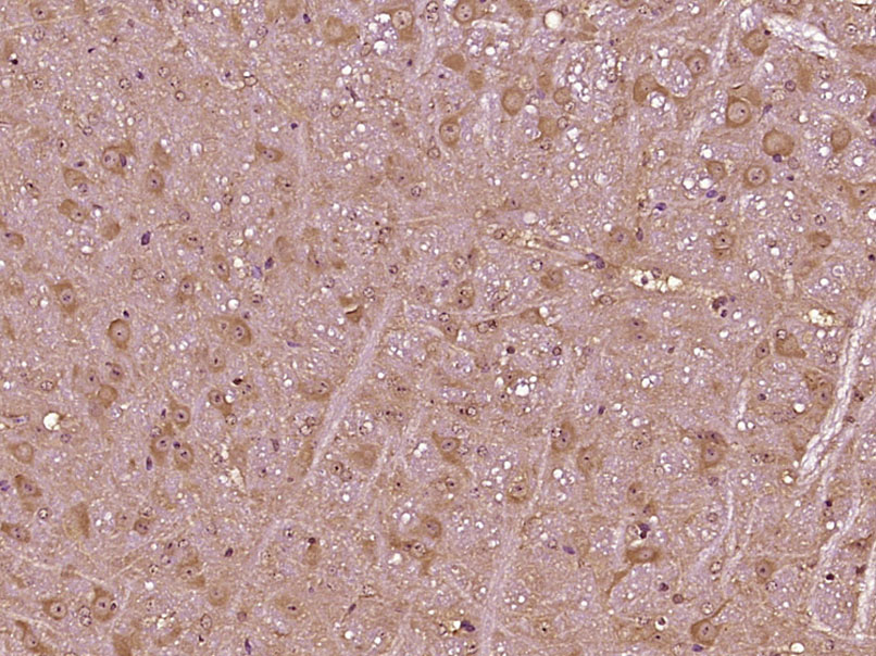 Paraformaldehyde-fixed, paraffin embedded (Mouse brain); Antigen retrieval by boiling in sodium citrate buffer (pH6.0) for 15min; Block endogenous peroxidase by 3% hydrogen peroxide for 20 minutes; Blocking buffer (normal goat serum) at 37°C for 30min; Antibody incubation with (VPS13D) Polyclonal Antibody, Unconjugated (bs-12766R) at 1:400 overnight at 4°C, followed by operating according to SP Kit(Rabbit) (sp-0023) instructionsand DAB staining.
