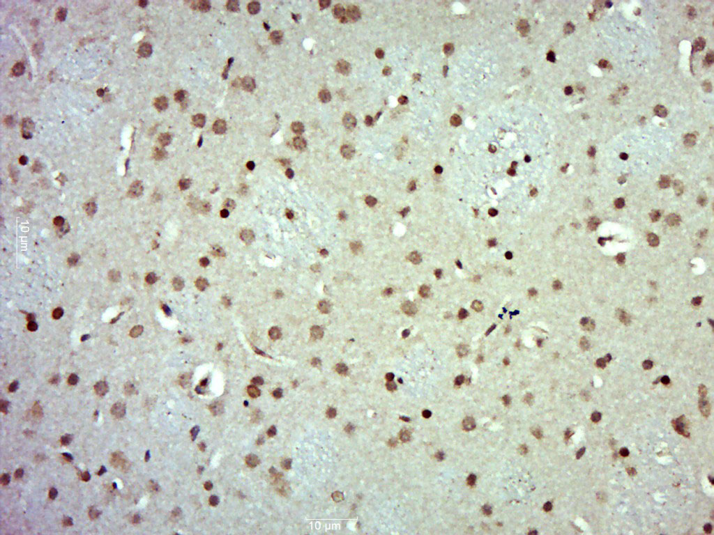 Paraformaldehyde-fixed, paraffin embedded (Mouse brain); Antigen retrieval by boiling in sodium citrate buffer (pH6.0) for 15min; Block endogenous peroxidase by 3% hydrogen peroxide for 20 minutes; Blocking buffer (normal goat serum) at 37°C for 30min; Antibody incubation with (ZNF238) Polyclonal Antibody, Unconjugated (bs-7195R) at 1:500 overnight at 4°C, followed by a conjugated secondary (sp-0023) for 20 minutes and DAB staining.