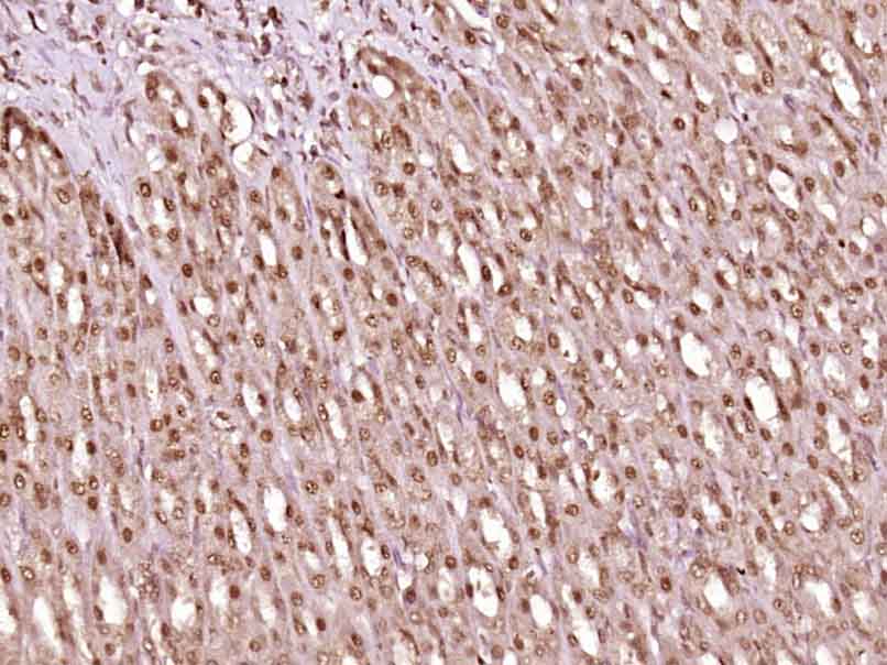 Paraformaldehyde-fixed, paraffin embedded (Rat stomach); Antigen retrieval by boiling in sodium citrate buffer (pH6.0) for 15min; Block endogenous peroxidase by 3% hydrogen peroxide for 20 minutes; Blocking buffer (normal goat serum) at 37°C for 30min; Antibody incubation with (ZNF238) Polyclonal Antibody, Unconjugated (bs-7195R) at 1:400 overnight at 4°C, followed by operating according to SP Kit(Rabbit) (sp-0023) instructionsand DAB staining.