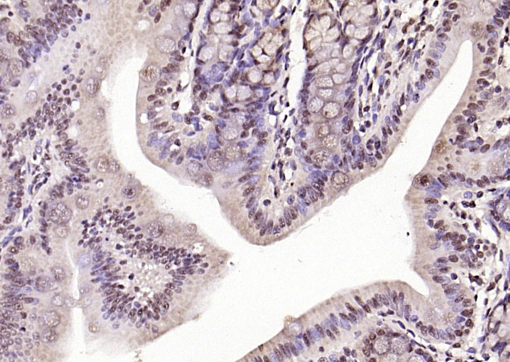 Paraformaldehyde-fixed, paraffin embedded (mouse colon); Antigen retrieval by boiling in sodium citrate buffer (pH6.0) for 15min; Block endogenous peroxidase by 3% hydrogen peroxide for 20 minutes; Blocking buffer (normal goat serum) at 37°C for 30min; Antibody incubation with (Phospho-FoxO1 (Ser319)) Polyclonal Antibody, Unconjugated (bs-20095R) at 1:200 overnight at 4°C, followed by operating according to SP Kit(Rabbit) (sp-0023) instructionsand DAB staining.