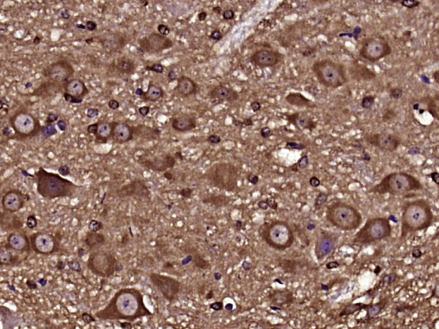 Paraformaldehyde-fixed, paraffin embedded (Mouse brain); Antigen retrieval by boiling in sodium citrate buffer (pH6.0) for 15min; Block endogenous peroxidase by 3% hydrogen peroxide for 20 minutes; Blocking buffer (normal goat serum) at 37°C for 30min; Antibody incubation with (SPINK13) Polyclonal Antibody, Unconjugated (bs-20834R) at 1:400 overnight at 4°C, followed by operating according to SP Kit(Rabbit) (sp-0023) instructionsand DAB staining.