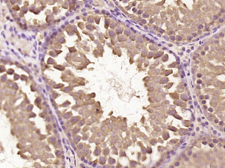 Paraformaldehyde-fixed, paraffin embedded (rat testis tissue); Antigen retrieval by boiling in sodium citrate buffer (pH6.0) for 15min; Block endogenous peroxidase by 3% hydrogen peroxide for 20 minutes; Blocking buffer (normal goat serum) at 37°C for 30min; Antibody incubation with (DNPEP) Polyclonal Antibody, Unconjugated (bs-20423R) at 1:400 overnight at 4°C, followed by operating according to SP Kit(Rabbit) (sp-0023) instructionsand DAB staining.