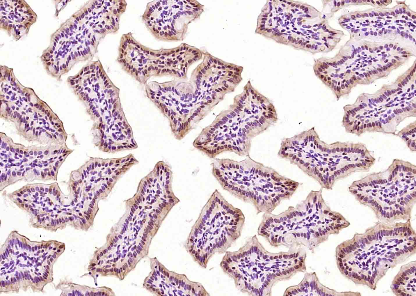 Paraformaldehyde-fixed, paraffin embedded (mouse intestine); Antigen retrieval by boiling in sodium citrate buffer (pH6.0) for 15min; Block endogenous peroxidase by 3% hydrogen peroxide for 20 minutes; Blocking buffer (normal goat serum) at 37°C for 30min; Antibody incubation with (PTRHD1) Polyclonal Antibody, Unconjugated (bs-4433R) at 1:200 overnight at 4°C, followed by operating according to SP Kit(Rabbit) (sp-0023) instructionsand DAB staining.