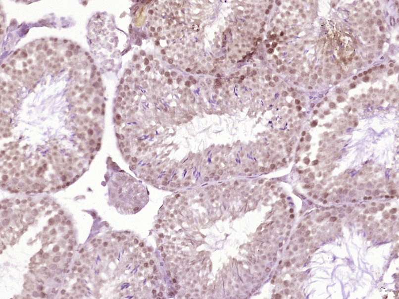 Paraformaldehyde-fixed, paraffin embedded (Mouse testis); Antigen retrieval by boiling in sodium citrate buffer (pH6.0) for 15min; Block endogenous peroxidase by 3% hydrogen peroxide for 20 minutes; Blocking buffer (normal goat serum) at 37°C for 30min; Antibody incubation with (SF3B14) Polyclonal Antibody, Unconjugated (bs-21103R) at 1:400 overnight at 4°C, followed by operating according to SP Kit(Rabbit) (sp-0023) instructionsand DAB staining.